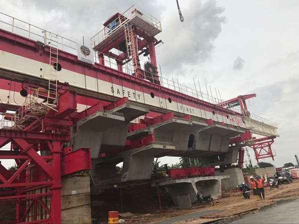 通聯(lián)600t節(jié)段拼裝接橋機(jī)在印尼雅加達(dá)工地順利完成第一片梁的拼裝。